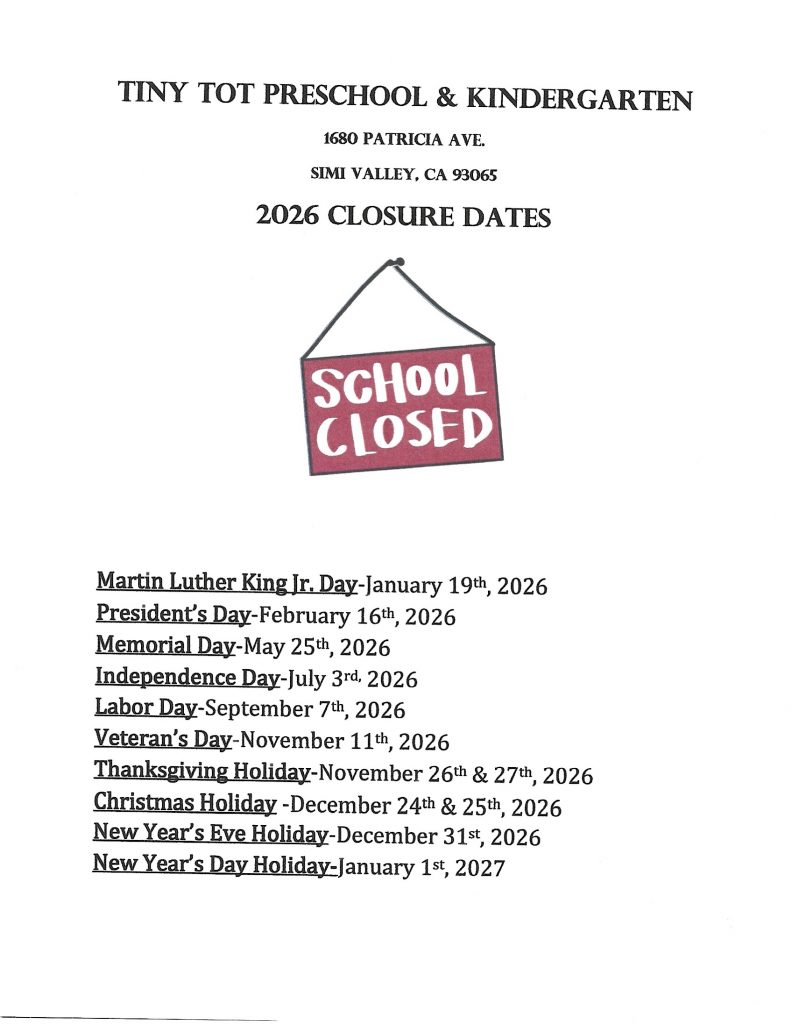 Tiny Tot Preschool & Kindergarten 2026 Closure Dates