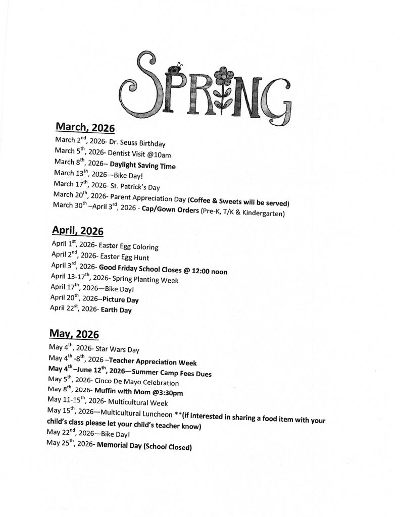 Spring has suddenly arrived! Tiny Tot Preschool & Kindergarten has organized exciting events to celebrate the season with our preschool students. Since the 1960s, Tiny Tot Preschool & Kindergarten has been dedicated to providing engaging childcare activities. The best way to share what we do at Tiny Tot Preschool & Kindergarten is through word of mouth, so please tell your friends and community about us. Below is the calendar of events for Spring 2026.